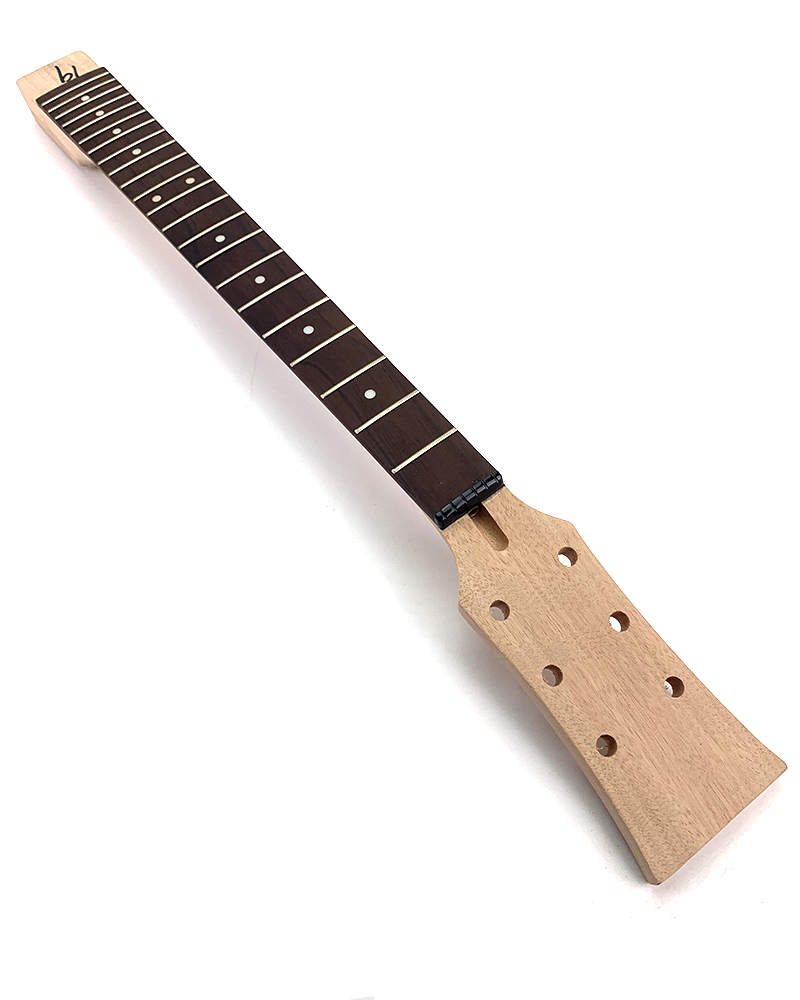 This is a Maple Neck with Rosewood Fretboard to suit double-cut set neck type kits, where the neck heel slot joins the neck pickup cavity.  It has 22 Frets and a blank “Paddle” style headstock. Machine head holes are drilled.